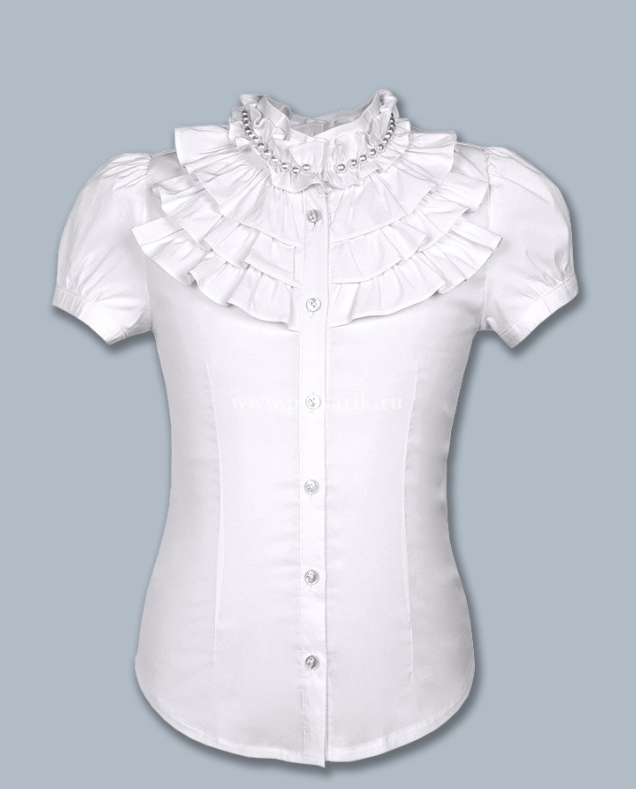 Продукция: Отделка: блузка для девочки на пуговицах с воротником-стойкой и коротким рукавом <<фонарик>>. На груди четырехъярусное элегантное жабо с рюшами из основной ткани. Верхний ярус жабо охвачен декоративным жемчужным ожерельем. Пуговицы со стразами.