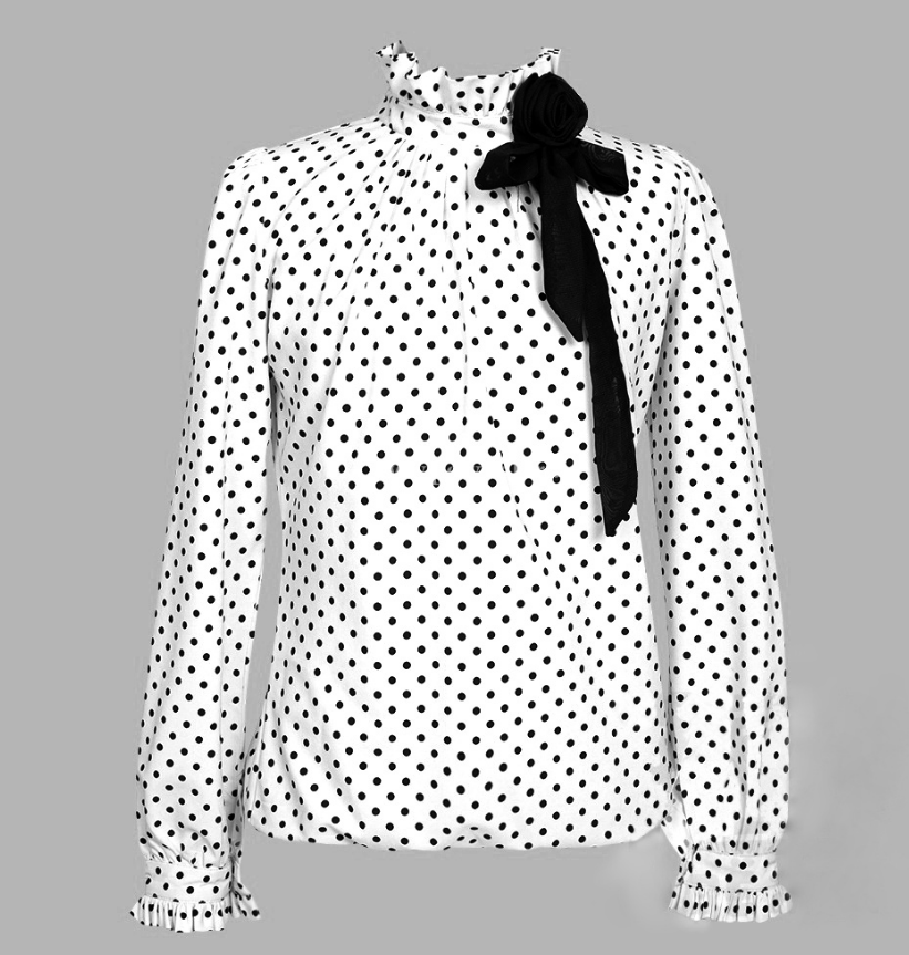 Продукция: Отделка: Воротник-стойка с рюшами из основной ткани. Модель свободного покроя с декоративным элементом на горловине в виде темно-синей розы с бантом. От горловины ткань присборена, заложены мягкие струящиеся складки к середине полочки. Низ изделия и рукава <<фонарик>> на резинке.