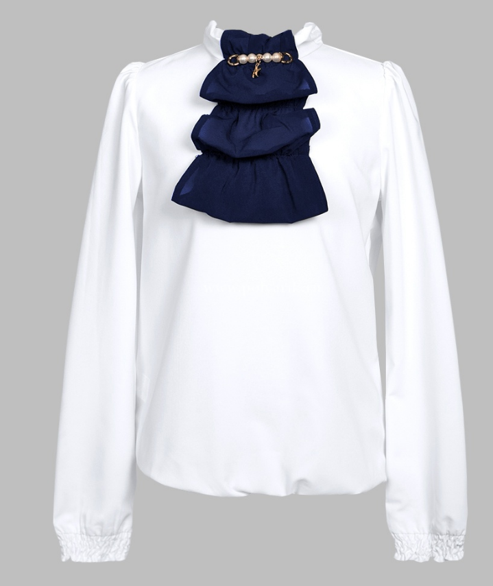 Продукция: Отделка: Воротник-стойка с рюшами из основной ткани. Модель свободного покроя с декоративным элементом на горловине в виде темно-синего жабо, подколоього жемчужной брошью. От горловины ткань присборена, заложены мягкие струящиеся складки к середине полочки. Низ изделия и рукава <<фонарик>> на резинке.