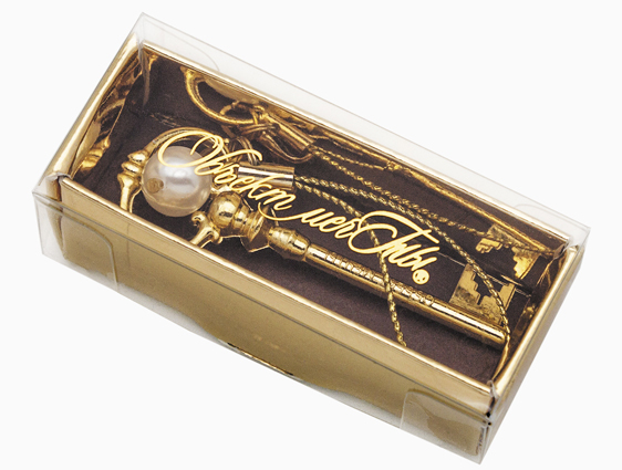 Брелок упакован в прозрачную коробочку с золотым дном.