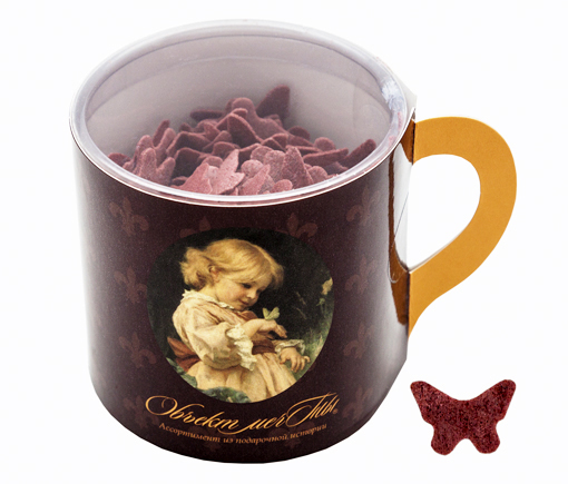 Мыло в форме крыльев бабочки. Цвет – шоколад. Аромат шоколада. Вес мыла – 22 г. Упаковка – пластиковая коробочка в форме кофейной чашечки диаметром 6 см, высотой 6 см. Вес мыла в коробочке – 32 г
