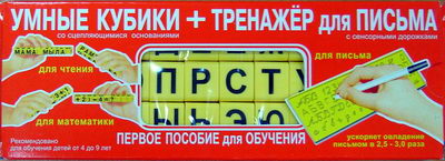 Пособие Умные кубики представляет собой набор из 36 кубиков, на гранях которых написаны буквы русского алфавита, знаки препинания, цифры и знаки математических действий. Благодаря специальной конструкции (выступ с одной стороны и отверстие с другой), кубики могут скрепляться между собой. Таким образом можно составлять слова, предложения, примеры. Так как кубики можно скреплять только определенным способом, ребенок не сможет расположить их неправильно (зеркально или к верх ногами), что важно на этапе обучения, чтобы не сформировались неправильные представления о буквах. Количество букв, цифр и знаков на гранях кубиков выбрано с учетом частоты их использования и позволяет составлять достаточно сложные слова, предложения и примеры.