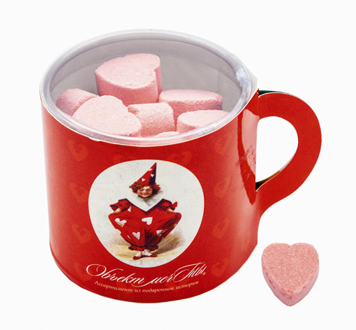 Упаковка соли для ванны — с особой интригой! 15 алых сердечек проживают в упаковке в форме кофейной чашечки.